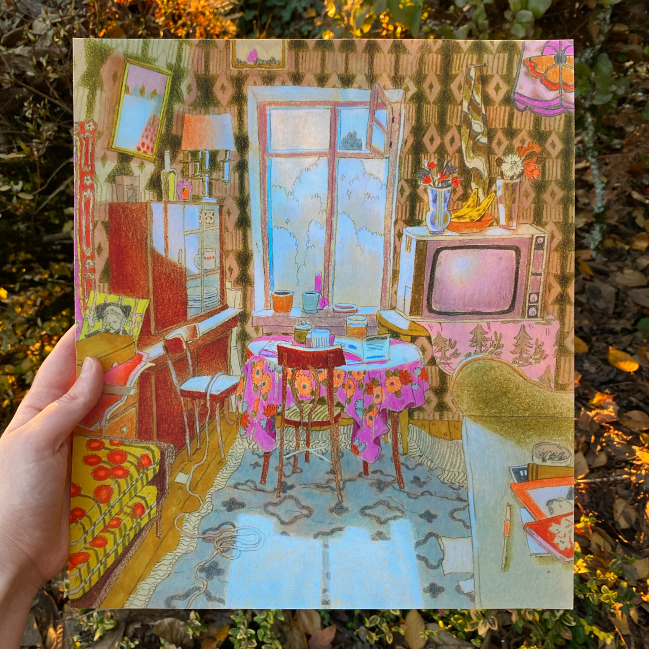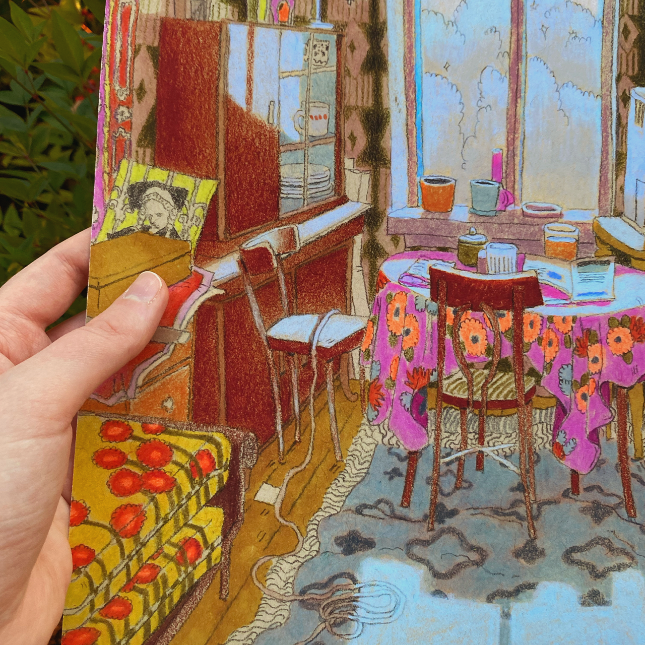 ★ A high quality giclee print on bright white Moab Entrada—an archival paper for beautiful, long-lasting prints, made of 100% cotton and slightly textured to create deep colors and a velvety matte finish. “Breakfast at the Window” is domestic scene framed around the bright, blue light of morning; the stillness of a home still waking up. This 12″ x 14″ print retains the intricate, handmade quality of the original artwork.