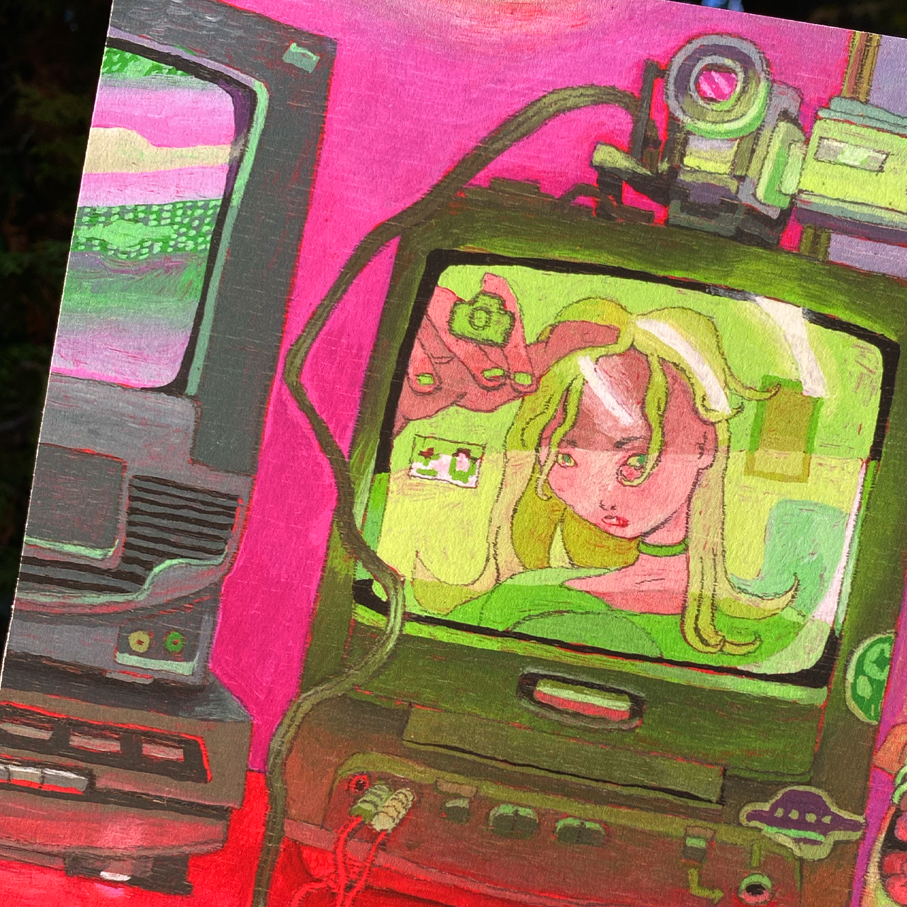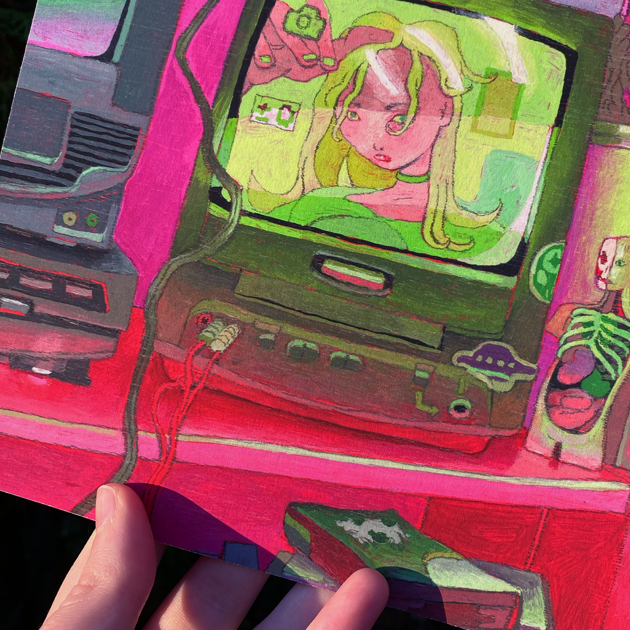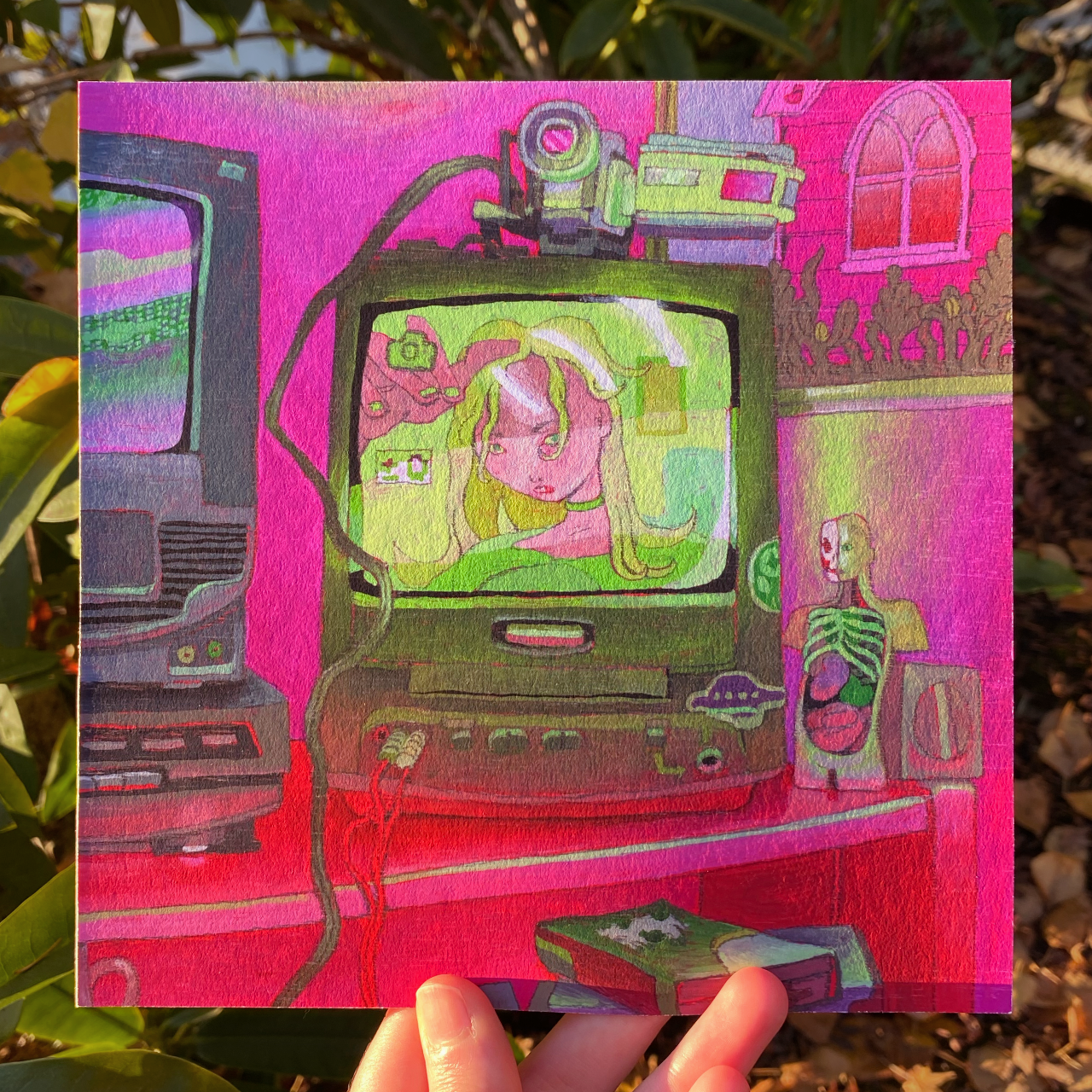 ★ A high quality giclee print on bright white Moab Entrada—an archival paper for beautiful, long-lasting prints, made of 100% cotton and slightly textured to create deep colors and a velvety matte finish. “Home Video” is an off-kilter painting in bright green and magenta, which lend themselves well to giclee printing. This 8″ x 8″ mini print retains the intricate, handmade quality of the original artwork.