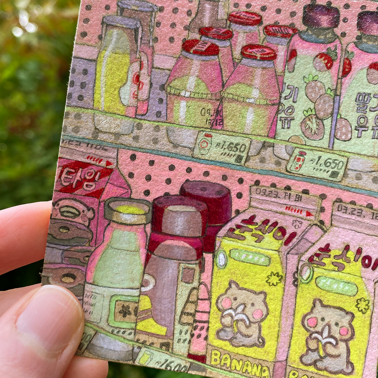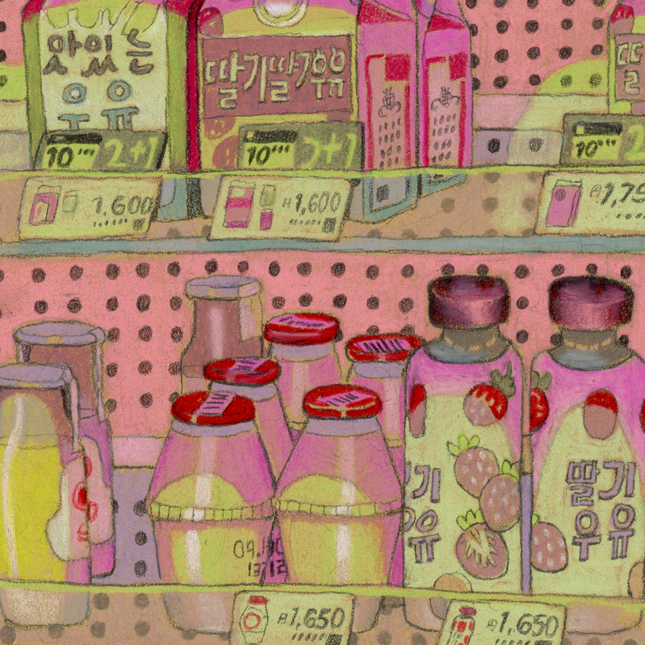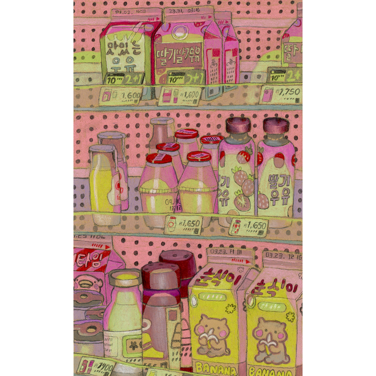 “Milk Shelf II.” is one in a series of grocery shelf still lives, finding moments of bright, overwhelming color in dull everyday existence.