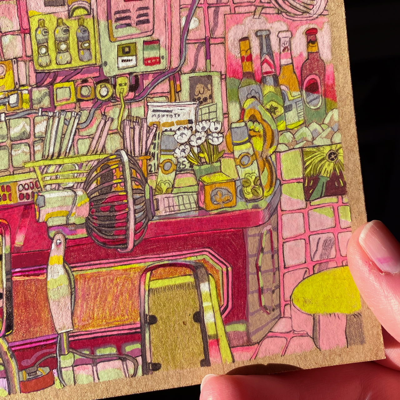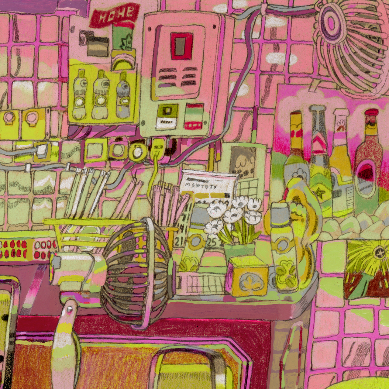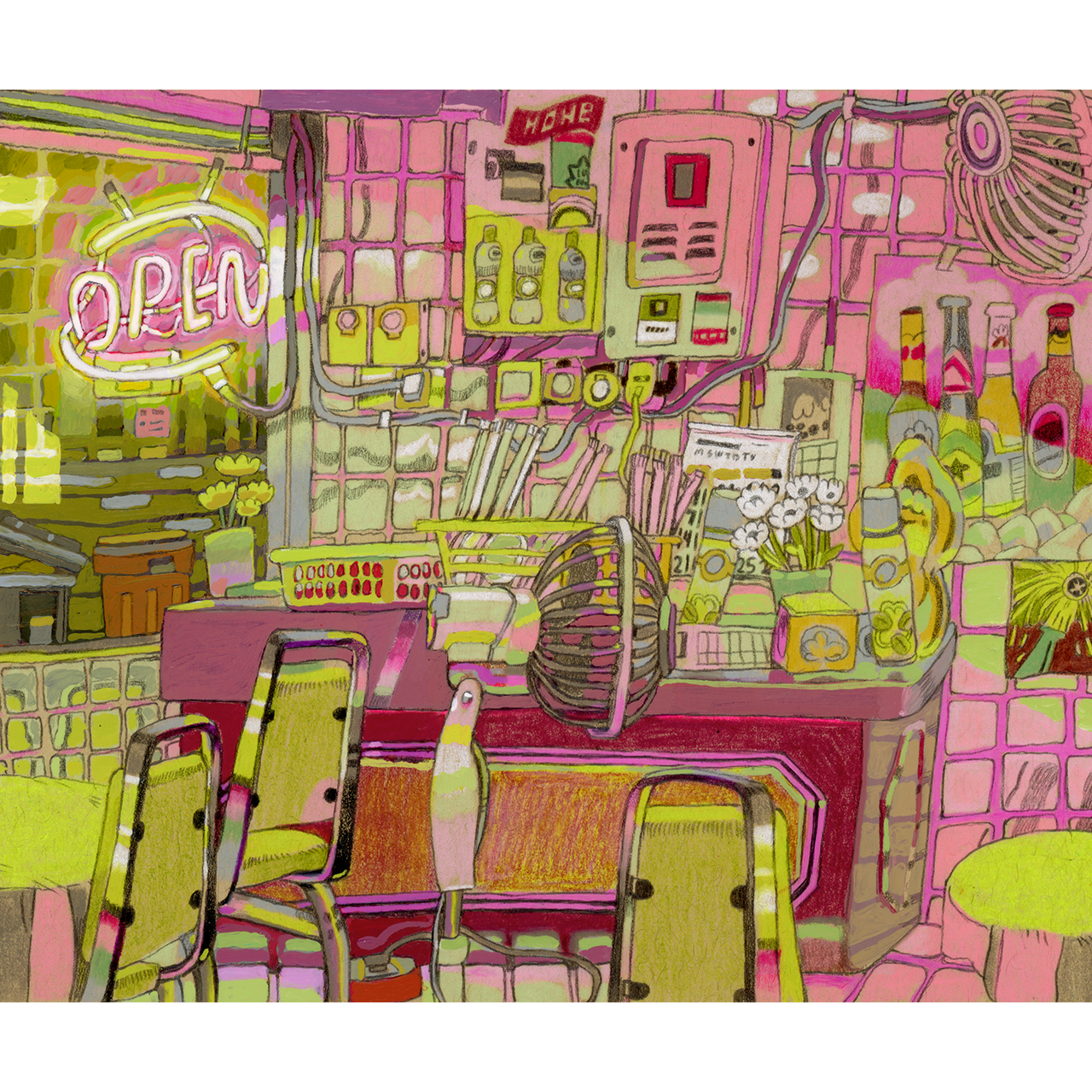 “Plastic Tablecloth” is the late-night takeout place with the neon signs and fake plants, drawn in pinks and yellows that feel like a summer night.